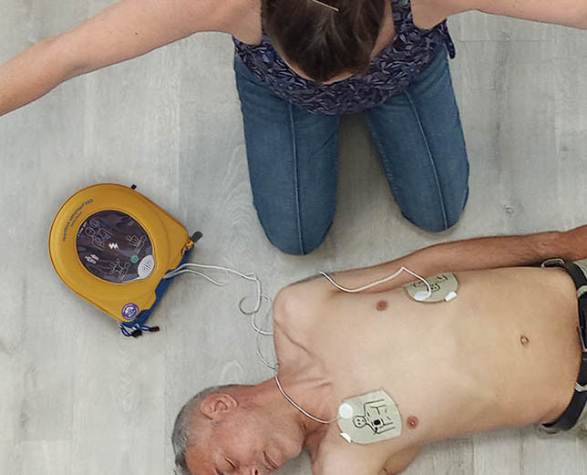 - Un cop som davant el desfibril·lador (DEA), hem d’obrir-ne la caixa amb decisió, agafar-lo i córrer per portar-lo fins on és la víctima. En cas que no s’hagi pogut trucar a emergències, ens hi podem comunicar des de la mateixa columna del DEA.